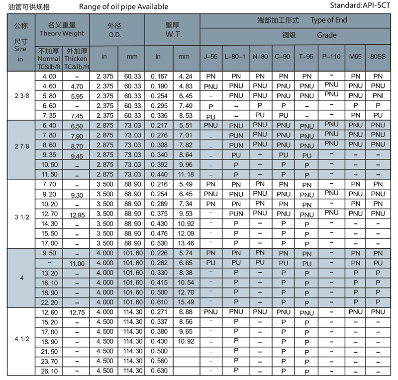 注:1、P-平端;N-不加厚、車(chē)螺紋帶接箍;U-外加厚、車(chē)螺紋帶接箍;T&C-車(chē)螺紋帶接箍,接箍均為標(biāo)準(zhǔn)接箍。 2、M65、80SS為非API鋼級(jí)。